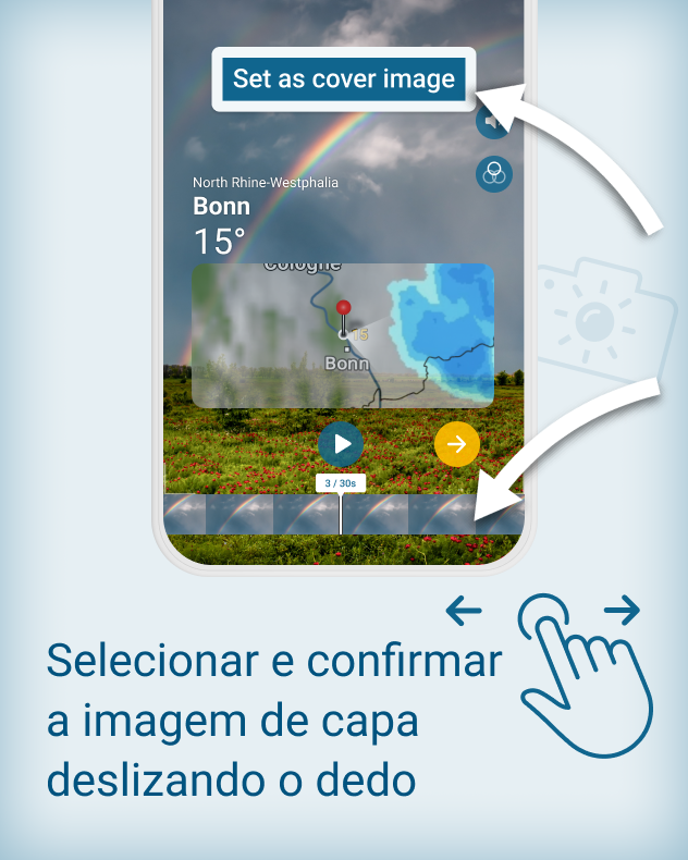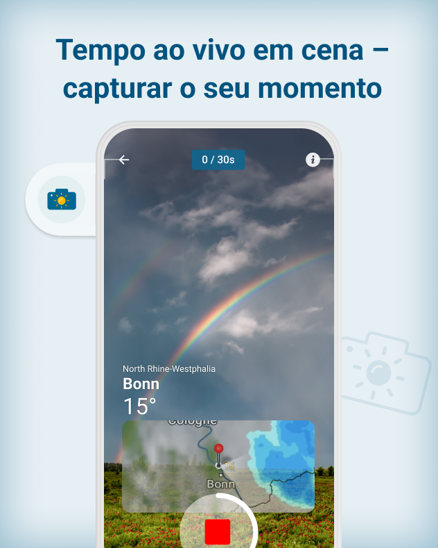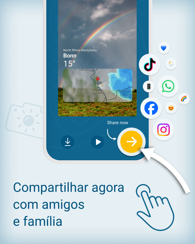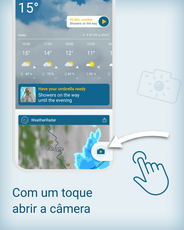 Com a nova função do aplicativo Clima & Radar, você pode capturar exatamente esses momentos – de forma rápida, fácil e diretamente do App. Nós adicionamos automaticamente o local, a hora e os dados meteorológicos – você não precisa configurar nada nem saber mais nada para fazer isso.